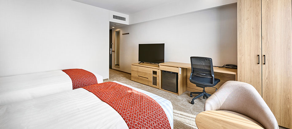 広さ30平米以上のゆったりとしたツインルームです。スーツケースを置いてもゆとりあるスペースを確保しております。