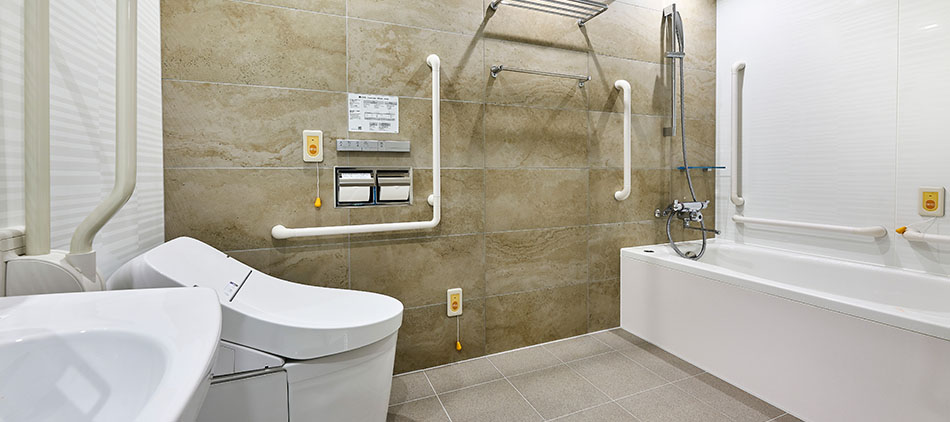 どなたでも快適にご利用いただけるユニバーサルデザインをコンセプトにしたお部屋。バスルームは手すりを設け、安全性を重視したユニットバスタイプを採用しております。