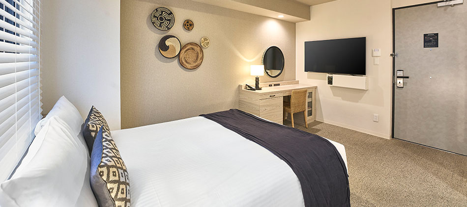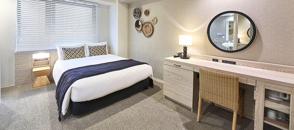 19.3平米の広さで、お部屋には段差がなくフラットになっています。バス・トイレはユニットバスになっていますが、通常の部屋よりも広くなっており、ベッドルームとの間にも段差はありません。