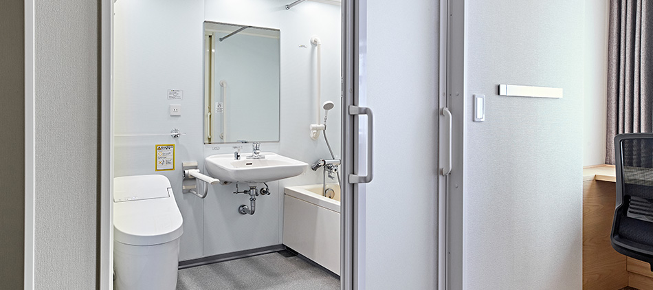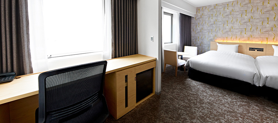 全ての方に優しいバリアフリー構造のユニバーサルツイン。ベッドルームとワークスペースが程よく独立し、「リラックスと集中」それぞれの時間を大切にできるお部屋です。※ベビーベッド設置可